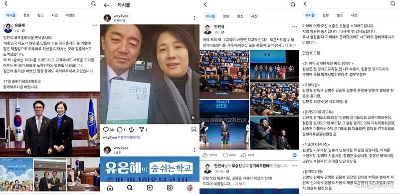 또한 유은혜 대표 인스타그램에는 강훈식 비서실장과 유 대표 저서의 책을 함께 셀카를 찍어 올리면서 정부 인사들의 지지로 보이는 게시물을 공개하기도 했다.