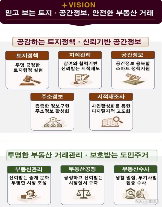 추진계획은 ▲투명하고 균형 잡힌 제도 운영으로 신뢰받는 토지행정 실현 ▲참여와 협력을 통한 신뢰받는 지적제도 정착 ▲공간정보 융·복합을 통한 스마트한 정책 지원 ▲촘촘한 주소정보 구현 및 주소정보 활성화 추진 ▲사업활성화를 통한 디지털지적 고도화 ▲신뢰받는 중개 문화와 투명한 부동산 시장 조성 ▲공정하고 신뢰받는 시장질서 구축 ▲생활밀접, 투기사범 집중수사 등 8대 전략을 바탕으로 한 92개 세부 이행과제로 구성됐다.