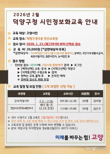 [리버럴미디어=공소리 기자] 고양특례시 덕양구는 고양시민의 디지털 역량 강화를 위해 ‘2026년 제1차 덕양구 시민정보화교육’ 수강생을 오는 22일부터 모집한다고 밝혔다.