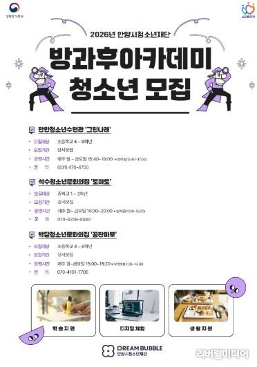 [리버럴미디어=공소리 기자] 안양시청소년재단은 공공 청소년 돌봄 사업인 청소년방과후아카데미의 2026년도 참여 청소년을 모집한다.