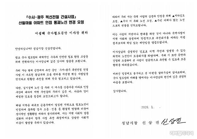 [리버럴미디어=공소리 기자] 성남시는 지난 16일 김윤덕 국토교통부 장관과 이성해 국가철도공단 이사장에게 ‘수서~광주 복선전철(이하 수광선) 건설사업’과 관련하여 여수동 산들마을 아파트 인접 통과 구간의 노선 변경을 요청하는 서한을 전달했다고 20일 밝혔다.