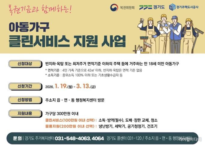 [리버럴미디어=공미소 기자] 부천시는 주거취약 아동의 건강한 성장과 주거권 보호를 위해 ‘2026년 아동가구 클린서비스 지원사업’을 복권기금과 함께 추진한다고 27일 밝혔다.