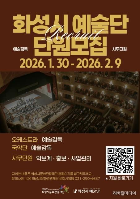 [리버럴미디어=공소리 기자] (재)화성시문화관광재단은 2026년 ‘화성시 예술단’을 이끌어갈 예술감독과 사무단원을 모집한다.