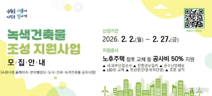[리버럴미디어=공소리 기자] 수원특례시가 2월 2일부터 27일까지 ‘2026년 녹색건축물 조성 지원사업’ 신청을 받는다.