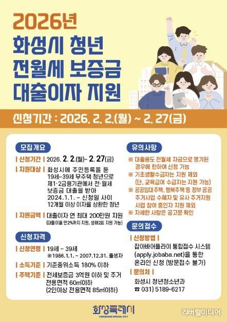 [리버럴미디어=공소리 기자] 화성특례시(시장 정명근)가 2일부터 오는 27일까지 청년들의 주거비 부담 경감 및 정주 여건 향상을 위해 ‘청년 전·월세 보증금 대출이자 지원사업’ 신청을 받는다.