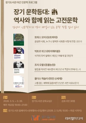 [리버럴미디어=공소리 기자] 김포시 장기도서관은 야간 인문학 프로그램 ‘장기 문학등대: 역사와 함께 읽는 고전문학’을 오는 3월 5일부터 3월 26일까지 매주 목요일 저녁 7시에 장기도서관 문화교실2에서 운영한다고 밝혔다.