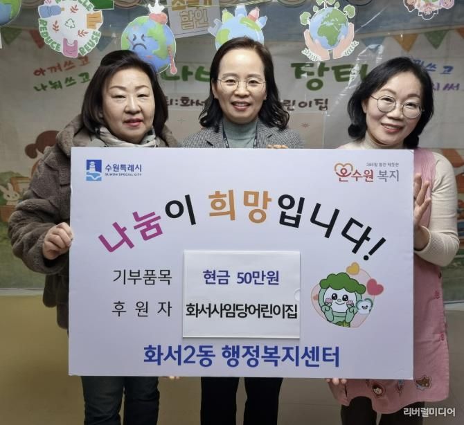 화서사임당어린이집은 지난 2일, 원아들과 학부모, 교직원이 함께 진행한 바자회 수익금 50만 원을 어려운 이웃을 위해 사용해 달라며 화서2동 행정복지센터에 기부했다.