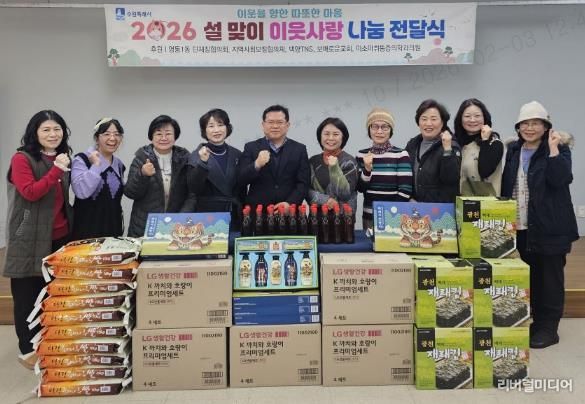 [리버럴미디어=공소리 기자] 영통구 영통1동은 지난 3일 영통1동 단체장협의회가 설 명절을 앞두고 관내 저소득 이웃을 위한 ‘설 맞이 이웃사랑 나눔 전달식’을 진행했다고 밝혔다.
