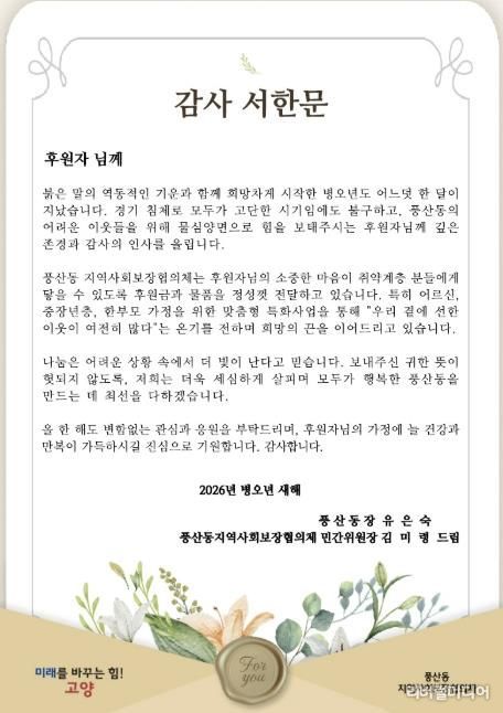 [리버럴미디어=공소리 기자] 고양특례시 일산동구 풍산동 지역사회보장협의체는 설명절을 앞둔 지난 3일 지난해 지역사회의 어려운 이웃을 위해 따뜻한 나눔을 실천한 후원자들에게 감사의 마음을 담은 서한문을 발송했다.