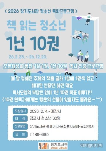 [리버럴미디어=공소리 기자] 김포시 장기도서관은 청소년의 자발적인 독서 습관 형성을 위해 청소년 특화프로그램 ‘책 읽는 청소년 1년 10권’을 오는 2월 23일부터 연말까지 운영한다.