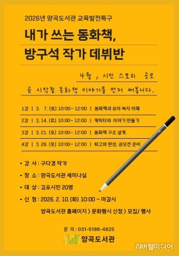 [리버럴미디어=공소리 기자] 김포시 양곡도서관은 오는 3월 7일부터 3월 28일까지 매주 토요일, 시민을 대상으로 한 그림책 글쓰기 수업 '내가 쓰는 동화책, 방구석 작가 데뷔반'을 운영한다.
