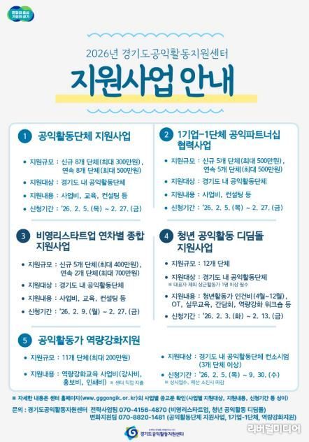 [리버럴미디어=공소리 기자] 경기도공익활동지원센터가 ‘2026년 경기도 공익활동 지원사업’에 참여할 도내 공익활동 단체를 모집한다.