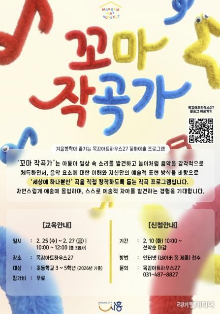 관내 거주하는 초등학생 3학년~5학년이라면 누구나 무료로 참여할 수 있다. 참여 신청은 2월 10일 10시부터 목감아트하우스27 또는 시흥문화예술 소통누리망(블로그ㆍ인스타그램)을 통해 가능하며 선착순으로 마감된다.
