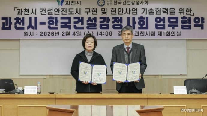 [리버럴미디어=공소리 기자] 과천시는 지난 4일 시청 제1회의실에서 신계용 과천시장과 (사)한국건설감정사회 김창근 회장이 참석한 가운데 ‘건설 안전 도시 구현을 위한 기술협력 업무협약’을 체결했다.