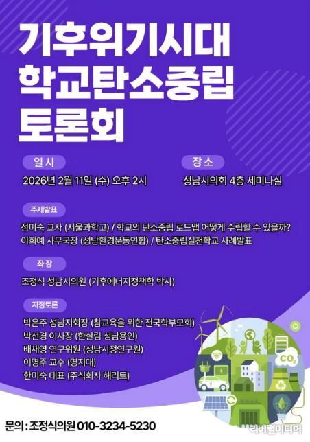 [리버럴미디어=공소리 기자] 기후위기 대응과 학교 현장의 탄소중립 실천 방안을 논의하기 위한 '기후위기 시대 학교 탄소중립 토론회'가 오는 2026년 2월 11일 오후 2시, 성남시의회 4층 세미나실에서 열린다.