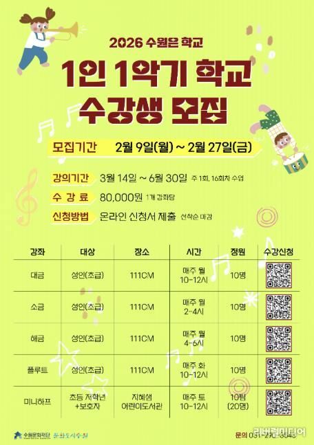 [리버럴미디어=공소리 기자] 수원문화재단이 오는 27일까지 시민 누구나 참여할 수 있는 ‘2026 수원은학교 1인 1악기 학교’ 수강생을 선착순으로 모집한다.