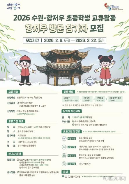[리버럴미디어=공소리 기자] 수원특례시는 ‘2026 수원–항저우 초등학생 상호방문교류’에 참여할 초등학생 10명을 2월 22일까지 모집한다.