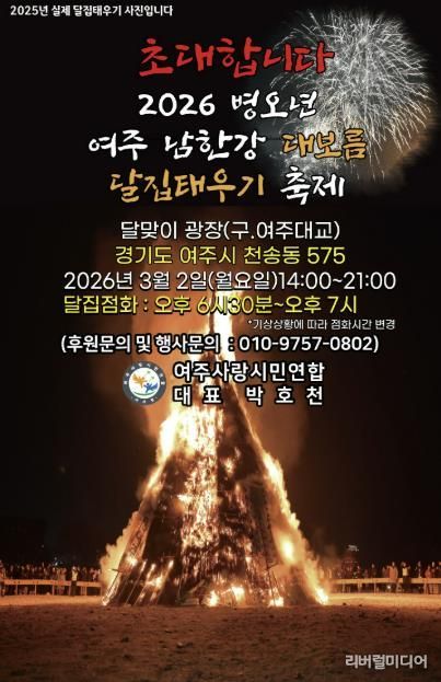 이충우 여주시장은 “정월대보름 달집태우기 행사를 통해 전통문화를 계승하고 주민 화합을 다지는 뜻깊은 시간이 되길 바란다.”며 “많은 시민들의 참여를 부탁드린다.”고 말했다.