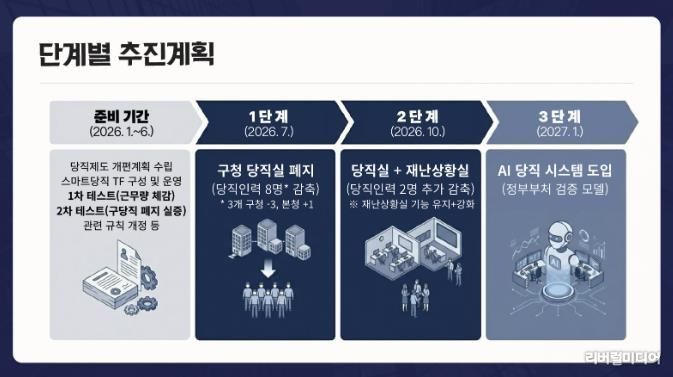 시는 올해 상반기를 사전 준비 기간으로 정하고, 8개 부서가 참여하는 AI 당직 전담조직(TF)을 구성하고 시·구청 당직 통합 시 근무량을 검증했다. 다음 달에는 구청 당직 폐지 시 예상되는 시민 불편과 사각지대를 시뮬레이션 방식으로 점검하고, 5월까지 조례·규칙 개정과 법제 심사를 마쳐 제도적 기반을 마련할 예정이다.