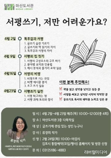 이번 특강은 『서평쓰기, 저만 어려운가요?』의 저자인 류경희 작가가 강사로 참여해 글쓰기 실전 경험을 바탕으로 서평 작성 과정을 시민 눈높이에 맞춰 쉽고 친근하게 전달할 예정이다. 수강생들은 서평을 쓰는 과정에서 자신만의 관점과 생각을 글로 풀어내는 경험을 쌓으며, 독서를 보다 깊이 있게 마주할 수 있다.