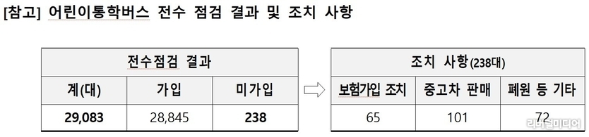 점검 결과, 의무보험에 가입하지 않은 차량 238대를 적발, 이 중 65대에 대해 즉시 보험에 가입하도록 조치했다. 나머지 적발 차량에 대해서는 전수 조사를 실시한 결과, 중고차 매각, 시설 폐원 등 기타 사유로 인해 도로 위를 운행하지 않고 있음을 확인했고, 현장 단속 3건을 하여 무보험 통학버스가 아이들을 태우는 위험 상황을 선제적으로 차단했다.