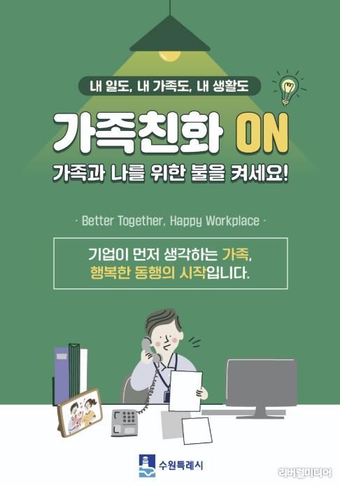 이를 위해 수원시는 일과 가정이 조화를 이루는 가족 친화적인 직장 분위기를 확산하고자 ‘일가(家)양득’ 사업을 시작한다. 300인 미만 중소사업장에서 조기퇴근이나 특별휴가 등 가족친화의 날을 운영하고, 돌봄·건강·여가·교육 분야 가족친화 분위기 조성 프로그램을 운영하면 장려금을 지급할 계획이다. 일과 가정이 양립할 수 있는 기업문화 확산을 위해 가족친화 인증기업 우수사례 발굴, 찾아가는 직장교육, 출생 친화 분위기 조성 유공자 포상 등을 진행할 예정이다.
