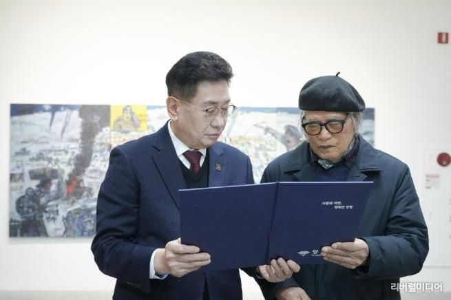 [리버럴미디어=공소리 기자] 원로작가 이동표 화백의 작품 기증식이 지난 23일 오전 11시 20분 양평군립미술관 지하 전시장에서 진행됐다. 기증식에서는 전진선 양평군수가 기증증서를 수여했으며, 이어 작가의 작품 설명과 전시 관람이 진행됐다. 기증 작품은 양평군립미술관 수장고에 보관되며, 군립미술관 기획 전시를 비롯해 향후 국제평화공원 및 양평박물관 개관 시 활용될 예정이다.