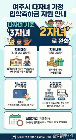 여주시 관계자는 “다자녀 기준 확대를 통해 보다 많은 가정이 실질적인 지원을 받을 수 있게 됐다. 입학을 앞둔 다자녀 가정에서는 기간 내 신청하여 혜택을 받길 바란다.”고 전했다.