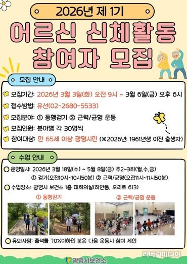 [리버럴미디어=공소리 기자] 광명시 보건소가 지역 어르신들의 건강 증진과 신체 기능 향상을 돕기 위해 ‘2026년 제1기 어르신 신체활동 프로그램’ 참여자를 모집한다.