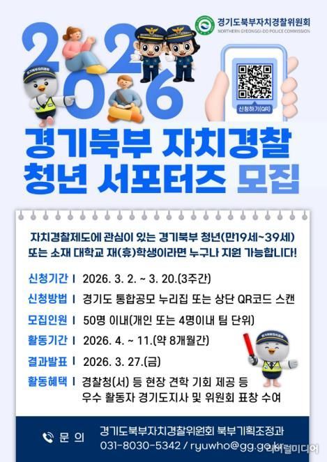 [리버럴미디어=공소리 기자] 경기도북부자치경찰위원회는 자치경찰제에 대한 청년층의 관심을 높이고 현장 중심 치안 활동을 함께할 ‘2026 경기북부 자치경찰 청년 서포터즈’를 3월 2일부터 20일까지 공개 모집한다.