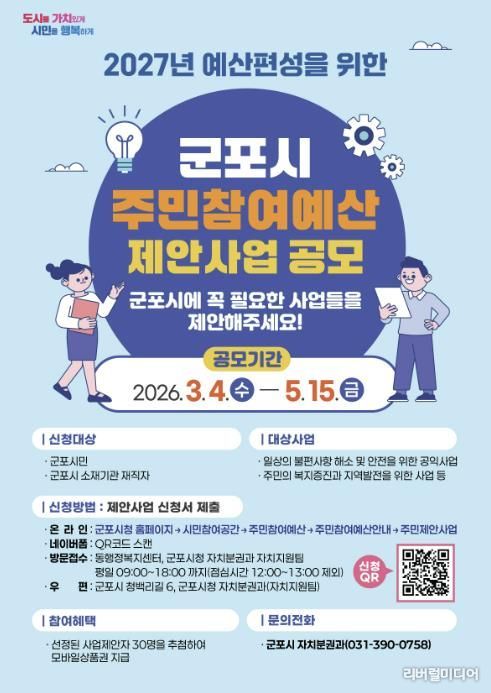 [리버럴미디어=공소리 기자] 군포시는 3월 4일부터 5월 15일까지 ‘2027년 예산편성을 위한 주민참여예산 제안사업’을 공모한다.