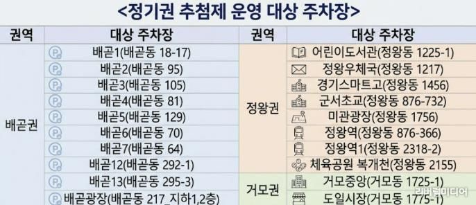 이번 추첨 대상 공영주차장은 배곧권의 배곧1~7호, 배곧12~13호, 배곧광장 10개소와 정왕권의 어린이도서관, 정왕우체국, 경기스마트고, 군서초교, 미관광장, 정왕역, 정왕역1, 체육공원 복개천 8개소, 거모권의 거모중앙, 도일시장 주차장 2개소를 포함하여 총 20개소다.