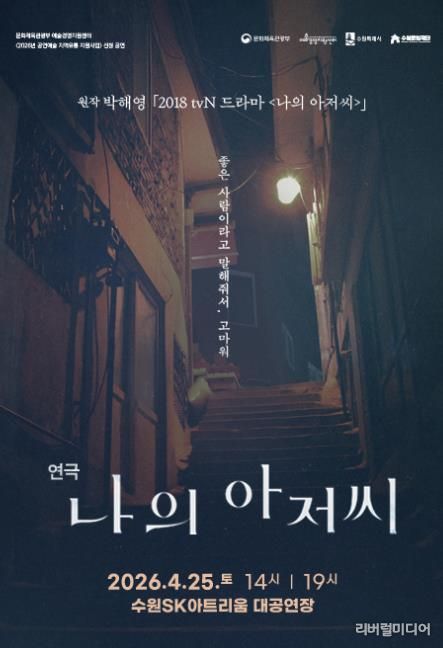 수원문화재단 관계자는 “수원SK아트리움은 전 세대가 공감할 수 있는 우수한 기획 공연을 꾸준히 선보여 왔다”며, “이번 ‘나의 아저씨’에서는 각자의 삶을 돌아보게 하는 따뜻한 이야기를 선보일 예정으로, 가족, 연인, 친구와 함께 공연장에서 봄날의 특별한 시간을 보내시길 바란다”고 전했다.
