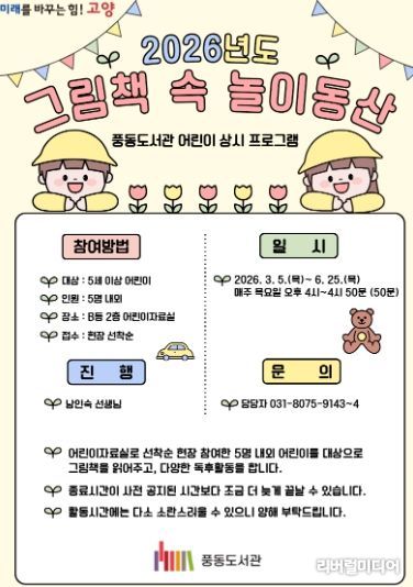 [리버럴미디어=공소리 기자] 고양특례시 풍동도서관은 어린이 그림책 읽어주기 상시 프로그램 ‘그림책 속 놀이동산’을 운영한다고 5일 밝혔다.