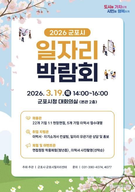 [리버럴미디어=공소리 기자] 군포시는 오는 3월 19일 오후 2시부터 시청 대회의실에서 ‘2026년 군포시 일자리 박람회’를 개최한다. 이번 박람회는 지역 내 우수 기업과 구직자가 직접 만나는 채용의 장으로 제조, 서비스, 물류배송, 의료복지 등 다양한 분야에서 폭넓은 취업 기회를 제공할 예정이다.