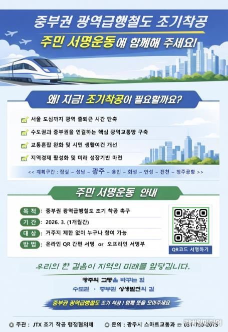 이번 서명운동은 ‘중부권 광역급행철도 조기 착공 행정협의체’가 주관하고 사업 관련 지방자치단체가 공동 취지 아래 지역별로 참여하는 방식으로 진행된다. 시는 서명에 담긴 시민 의견을 취합해 정부와 관계기관에 공식 전달할 계획이다.