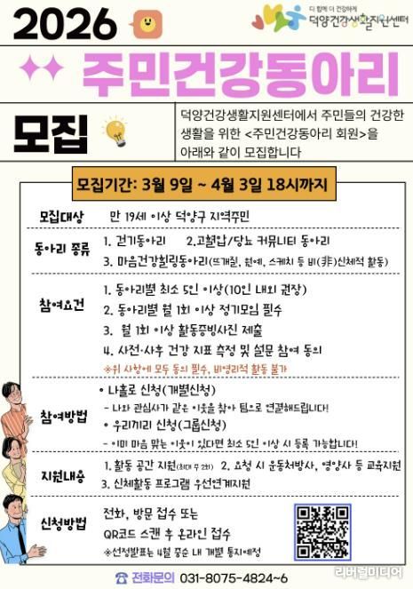 [리버럴미디어=공소리 기자] 고양특례시 덕양건강생활지원센터가 지역주민이 주도하는 건강 행복 도시조성을 위해 ‘주민건강동아리’참여자를 모집한다.