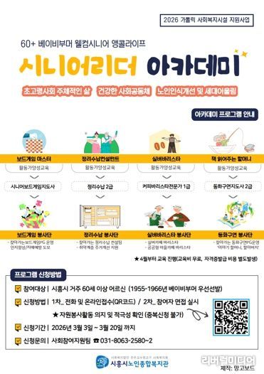 [리버럴미디어=공소리 기자] 시흥시노인종합복지관은 천주교수원교구의 지원을 받아 베이비부머 세대를 위한 전문자격 양성과정 ‘시니어리더 아카데미’를 오는 4월부터 운영하는 가운데, 참가 어르신을 모집한다.