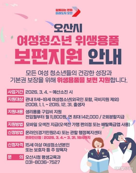 [리버럴미디어=공소리 기자] 오산시는 관내 11세부터 18세까지의 여성청소년을 대상으로 '여성청소년 위생용품 보편지원 사업'을 추진한다고 밝혔다.