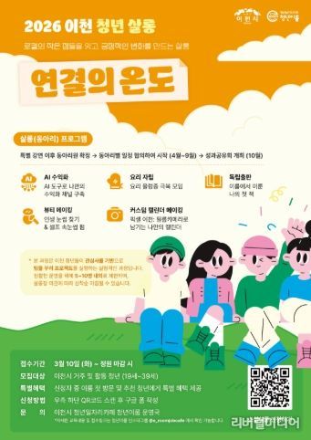 [리버럴미디어=공소리 기자] 이천시 청년일자리카페 청년이룸(이천시 경충대로 2701-32)은 지역 청년들의 관계망 형성 및 역량 강화를 위한 청년이룸 네트워킹 데이 ‘연결의 온도’ 참가자를 3월 10일부터 모집한다고 밝혔다.
