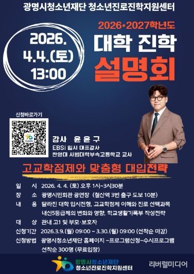 [리버럴미디어=공소리 기자] 광명시청소년재단 청소년진로진학지원센터는 오는 4월 4일 광명시민회관 공연장에서 '고교학점제 시대와 맞춤형 대입전략'을 주제로 2026·2027학년도 대학진학 설명회를 개최한다.