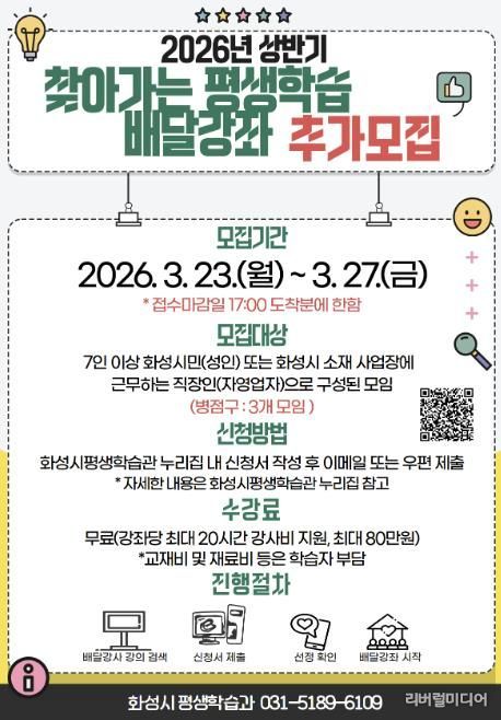 [리버럴미디어=공소리 기자] 화성특례시는 시민의 다양한 학습 수요를 반영한 맞춤형 평생학습 프로그램 운영을 위해 ‘2026년 상반기 찾아가는 평생학습 배달강좌’를 추가 모집한다고 밝혔다.