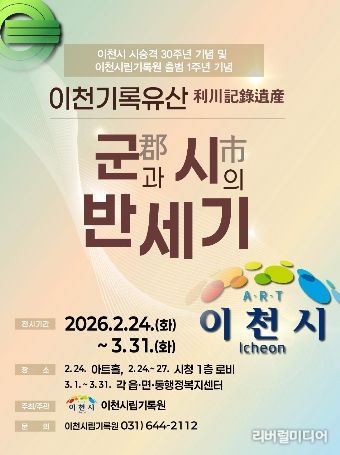 [리버럴미디어=공소리 기자] 이천시는 시 승격 30주년과 이천시립기록원 출범 1주년을 기념하여 기획된 ‘이천기록유산(利川記錄遺産): 군(郡)과 시(市)의 반세기’ 전시를 오는 3월 31일까지 14개 읍면동 행정복지센터에서 순회전시로 연장 개최한다고 밝혔다.