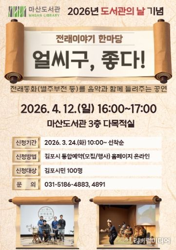 [리버럴미디어=공소리 기자] 김포시 마산도서관은 제4회 도서관의 날을 맞아 오는 4월 12일 오후 4시부터 5시까지 마산도서관 3층 다목적실에서 전래이야기 한마당 '얼씨구, 좋다!'를 운영한다.