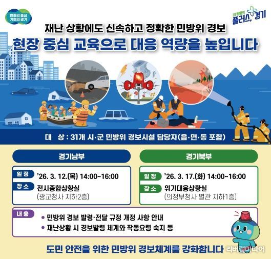 이번 교육은 올해 1월 ‘민방위 경보 발령·전달 규정’ 개정으로 대형 재난시에도 민방위 사이렌 활용을 확대 운영할 수 있게 된 데 따른 조치다. 시군 읍면동 경보담당 직원들의 재난경보 대응 체계와 현장 담당자의 실무 역량을 강화하기 위해 마련했다. 교육은 두 차례에 걸쳐 12일 경기도청 광교청사 전시종합상황실과 17일 경기도청 북부청사 위기대응상황실에서 진행된다.
