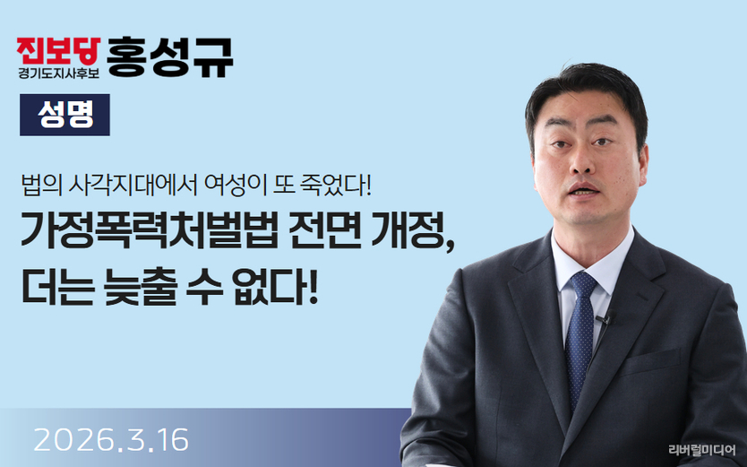[리버럴미디어=공소리 기자] 홍성규 진보당 경기도지사 후보는 16일, 최근 남양주시에서 스토킹 보호 대상인 여성이 살해된 사건과 관련하여 성명을 내고 "법의 사각지대에서 여성이 또 죽었다! 가정폭력처벌법 전면 개정, 더는 늦출 수 없다"고 통렬히 촉구했다.