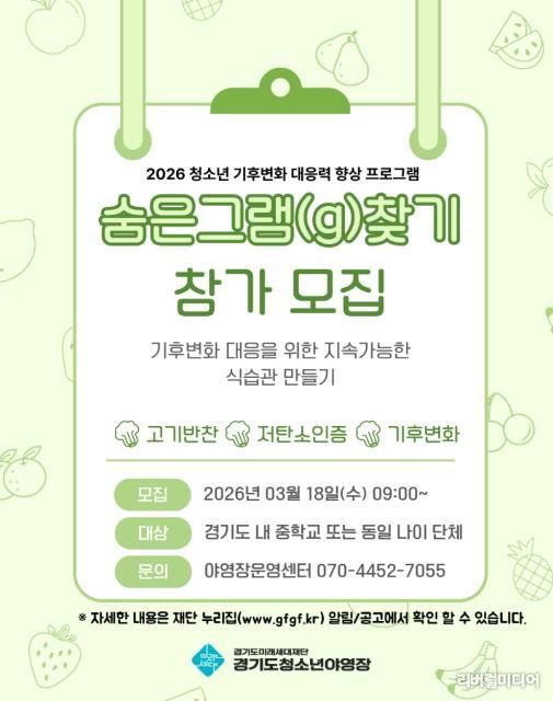 [리버럴미디어=공소리 기자] 경기도미래세대재단은 18일부터 기후변화 대응 체험형 교육 ‘숨은 그램 찾기’ 참가 단체·학교를 모집한다.