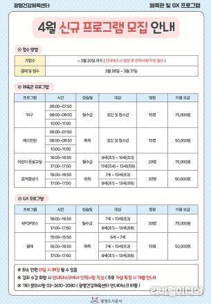 [리버럴미디어=공소리 기자] 광명도시공사는 광명건강체육센터에서 시민들의 건강 증진과 생활체육 활성화를 위해 체육관 및 GX실 4월 신규 프로그램 회원을 모집한다고 밝혔다.