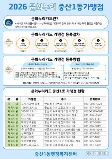 최정원 중산1동장은 “관내 소상공인들에게 문화누리카드 가맹점 등록을 안내해 독거노인, 장애인 등이 가까운 지역에서도 문화누리카드를 사용하는 데 불편을 최소화할 수 있도록 노력하겠다”고 전했다.
