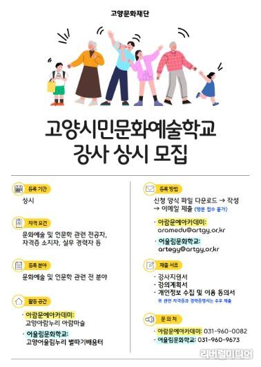 [리버럴미디어=공소리 기자] 고양문화재단은 시민들에게 참신하고 수준 높은 문화예술교육 서비스를 제공하기 위해 ‘고양시민문화예술학교’(아람문예아카데미 및 어울림문화학교) 강사 인력풀(POOL)을 상시 모집한다.